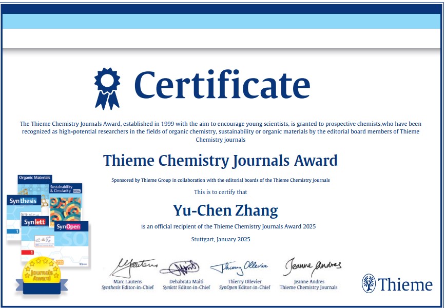 近日,Thieme学术出版集团公布了2025年度“Thieme Chemistry Journals Award”学术奖的获奖名单,我校化学与材料科学学院张宇辰教授成功入选,成为该学术奖2025年度的获得者之一。