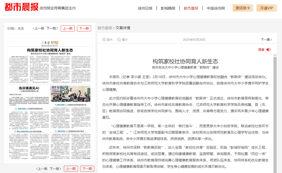 都市晨报3月20日报道我校教育科学学院与徐州市家校共育教育协会联合助推徐州市大中小学携手呵护学生心理健康,报道内容如下: