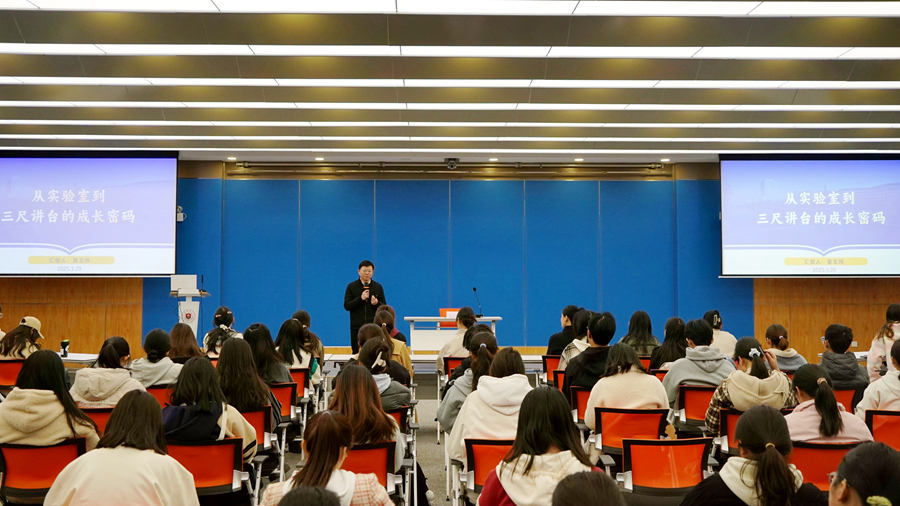 活动中,董玉玮深情回忆了本科和硕士研究生阶段的求学时光,讲述了大学生活的趣事,并从“做理论的实践者”“做创新的思想者”“做终身的学习者”三个方面,为学弟学妹们揭示了自己从实验室到三尺讲台的“成长密码”,分享了自己对“要不要就业”“要不要考博”“如何上好一节课”“为什么要终身学习”“如何解决复杂问题”等问题的认识与思考。董玉玮向学弟学妹提出三点建议,一是要自觉加强学习,勇于实践,把知识转化为能力,在知行合一中练就过硬本领;二是要增强独立思考、自主探究的意识,激发自身创新潜能,努力在学习和工作中做到人无我有、人有我优;三是要珍惜当下,牢牢把握历史机遇,深刻认识自身所肩负的时代使命,敢担当、能吃苦、肯奋斗。