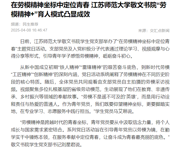 交汇点新闻4月8日报道我校敬文书院劳模精神育人模式,报道内容如下:
