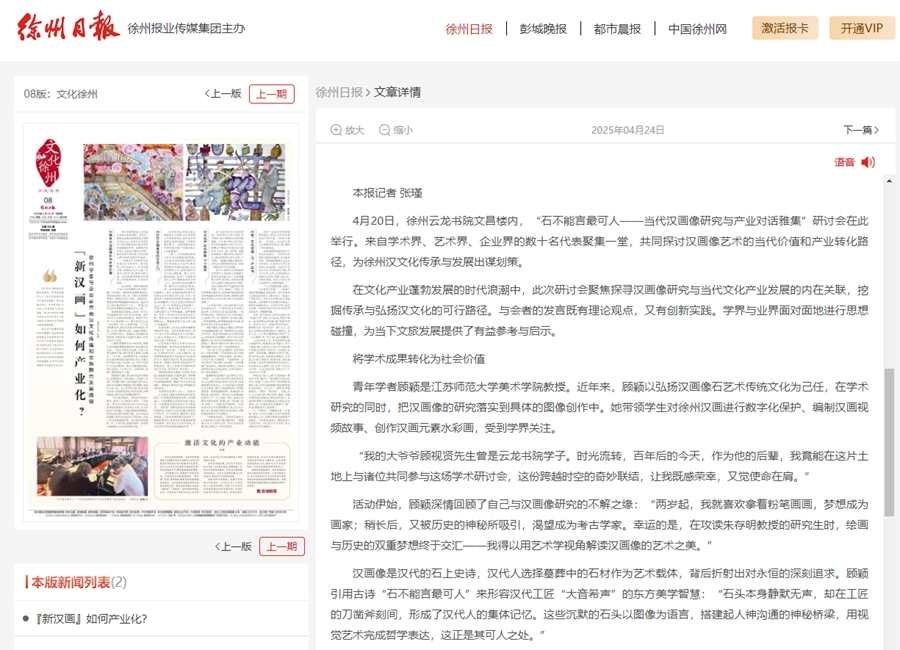 徐州日报4月24日报道我校与徐州市政府共建徐州云龙书院举办的当代汉画像研究与产业对话雅集研讨会,并采访我校专家学者,报道内容如下:
