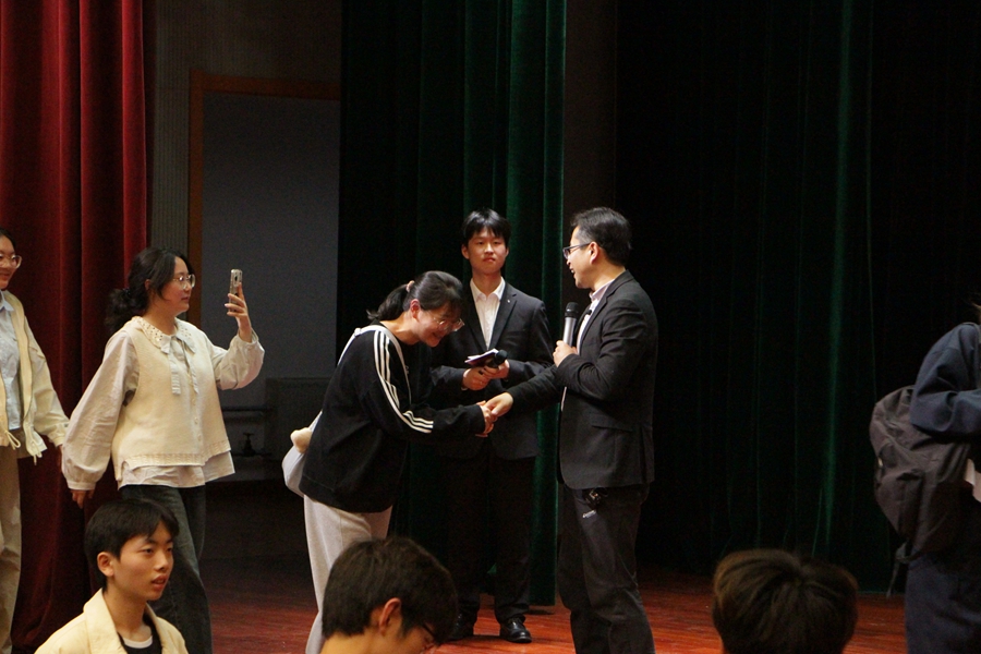 在趣味问答环节,宋浩结合“数学学科人文温度”“心境变化”等提问,强调专业素养与人文关怀并重,并分享个人成长感悟,鼓励学生保持积极心态,尊重缘分与自我成长。他寄语学子珍惜校园时光,高质量完成学业,全力冲刺更高学术舞台;同时通过努力工作,为所爱之人创造更有品质的生活。现场互动热烈,提问的学生纷纷与他合影,活动尾声宋浩与在场同学一一握手致意。