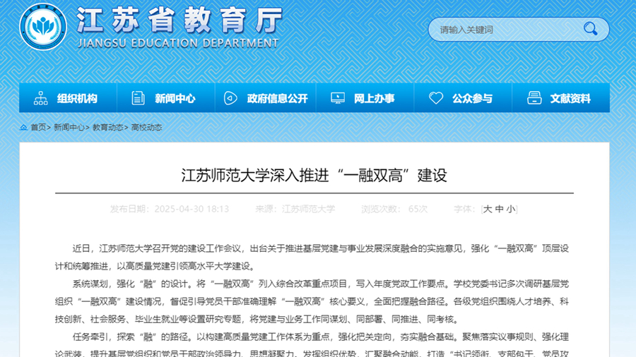 近日,江苏师范大学召开党的建设工作会议,出台关于推进基层党建与事业发展深度融合的实施意见,强化“一融双高”顶层设计和统筹推进,以高质量党建引领高水平大学建设。
