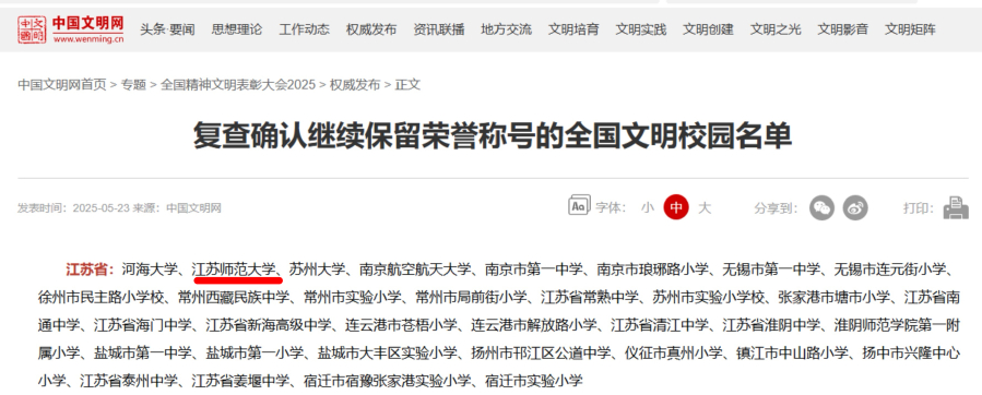 2017年,我校获评首届“全国文明校园”称号,2020年、2025年蝉联该项荣誉。站在新起点,学校将以更加饱满的热情、更加务实的作风、更加创新的思维,不断擦亮“全国文明校园”金字招牌,推动校园文明建设向更高层次迈进,为全面建设高水平大学而不懈奋斗。