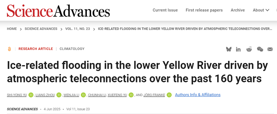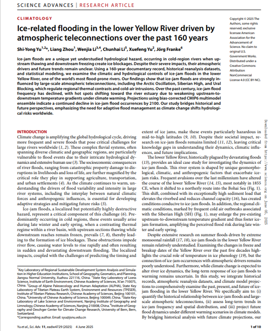 近日,我校地理测绘与城乡规划学院环境演变研究团队以唯一通讯作者单位和第一作者单位在国际顶级期刊《Science Advances》上发表了一项突破性研究成果,系统揭示了黄河下游凌汛洪水在过去160年中的时空演变规律及其对全球变暖的响应机制。这一研究不仅为寒区河流洪水管理提供了全新的理论框架,还为相关政策制定和防灾减灾工作提供了重要科学依据。