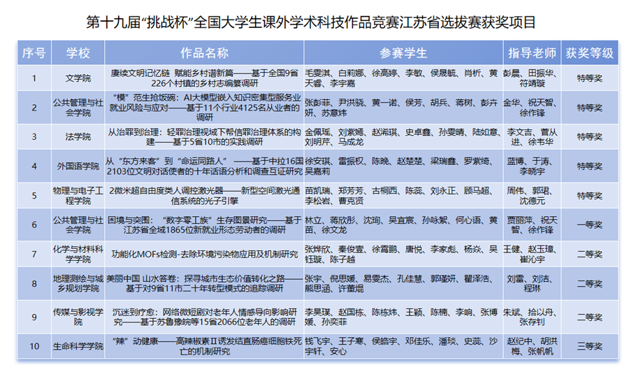 本届比赛中,文学院《赓续文明记忆链赋能乡村谱新篇——基于全国9省226个村镇的乡村志编纂调研》、公共管理与社会学院《“模”范生抢饭碗:AI大模型嵌入知识密集型服务业就业风险与应对——基于11个行业4125名从业者的调研》、法学院《从治罪到治理:轻罪治理视域下帮信罪治理体系的构建——基于5省10市的实践调研》、外国语学院《从“东方来客”到“命运同路人”——基于中拉16国2103位文明对话使者的十年话语分析和调查互证研究》、物理与电子工程学院《2微米超自由度类人调控激光器——新型空间激光通信系统的光子引擎》五个项目荣获特等奖,公共管理与社会学院《困境与突围:“数字零工族”生存图景研究——基于江苏省全域1865位新就业形态劳动者的调研》荣获一等奖,化学与材料科学学院《功能化MOFs检测-去除环境污染物应用及机制研究》、地理测绘与城乡规划学院《美丽中国山水答卷:探寻城市生态价值转化之路——基于对9省11市二十年转型模式的追踪调研》、传媒与影视学院《沉迷到疗愈:网络微短剧对老年人情感导向影响研究——基于苏鲁豫皖等15省2066位老年人的调研》三个项目荣获二等奖,生命科学学院《“辣”动健康——高辣椒素Ⅱ诱发结直肠癌细胞铁死亡的机制研究》荣获三等奖。