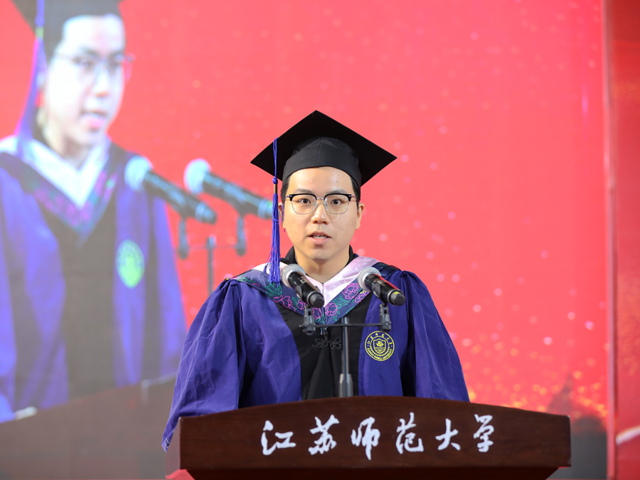 马克思主义学院焦天震作为毕业研究生代表发言,并分享了三点感悟。一是要以信仰为炬,照亮真理的求索之路;二是要以笃实为犁,深耕学术的丰沃原野;三是要以梦想为帆,奔赴强国的广阔天地。他号召全体毕业研究生永远保持“敢教日月换新天”的信念、“板凳要坐十年冷”的坚守、“直挂云帆济沧海”的勇气,在各自领域书写江苏师大人的青春答卷。