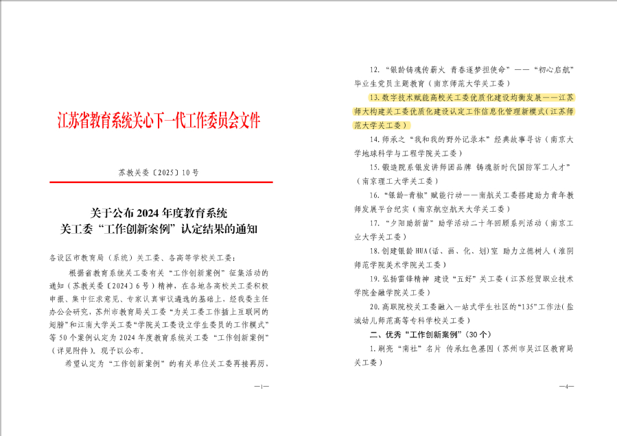 近日,江苏省教育系统关心下一代工作委员会公布了2024年度“工作创新案例”认定结果(详见苏教关委〔2025〕10号文),我校关工委报送的案例《数字技术赋能高校关工委优质化建设均衡发展——江苏师大构建关工委优质化建设认定工作信息化管理新模式》荣获“最佳工作创新案例”。