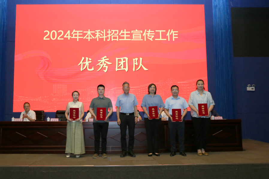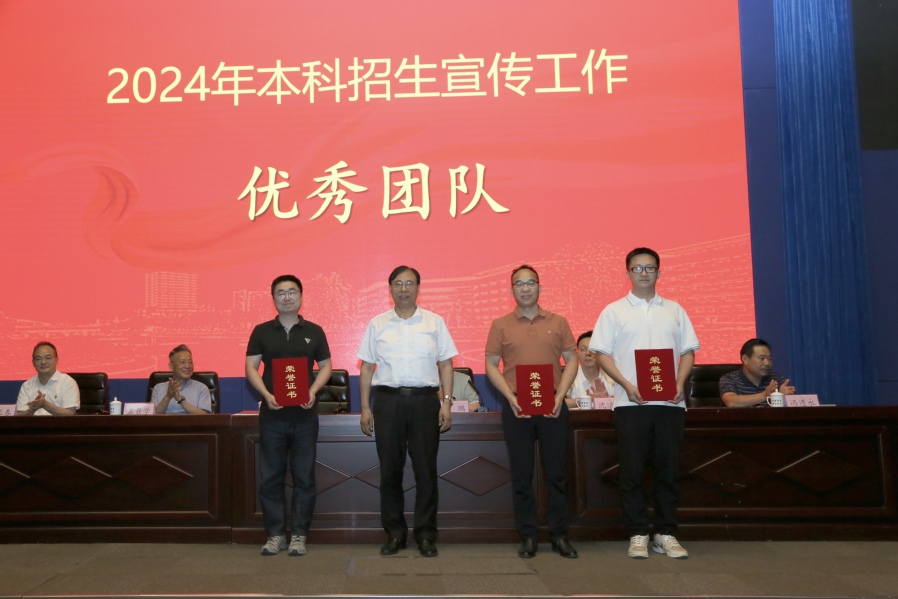 杜增吉在会上讲话。他首先肯定了2024年的招生工作成效,向受表彰的2024年招生宣传优秀团队和先进个人表示祝贺,向奋战在招生一线的师生员工表示感谢。结合即将开展的新一轮招生宣传工作,杜增吉指出:一要提高站位,胸怀大局,切实增强责任感。各部门、各学院要牢固树立“全校一盘棋”的思想,把本科招生宣传作为当前的重点工作来抓,确保优质生源持续汇聚;二要靶向发力,深挖特色,全面提升精准度。聚焦办学特色和优势学科,深入挖掘学校人才培养方面的优势亮点,针对不同受众群体采取差异化宣传策略,精心设计宣传内容,持续增强学校吸引力;三要打破定式,创新方式,着力拓展新路径。要把握融媒体时代流量特征,创新性开展招生宣传工作,通过线上线下联动、校内校外协同、师生校友互动的全方位宣传模式,让宣传内容更生动、形式更丰富、效果更显著,实现招生宣传效益的最大化;四要加强协同,全员参与,全力构建新格局。各学院、各部门要立足实际、强化担当,统筹推进招生宣传与业务工作深度融合,选派精干力量参与宣传,鼓励专家教授主动发声,在校师生积极代言,各部门通力协作,形成齐抓共管的良好局面。