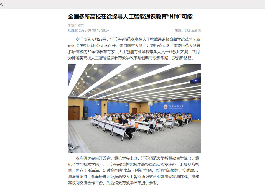 新华日报交汇点新闻6月30日报道江苏省师范类高校人工智能通识教育教学改革与创新研讨会在我校召开,报道内容如下: