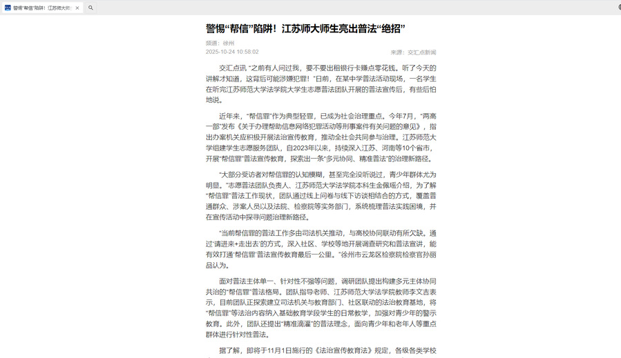 近年来,“帮信罪”作为典型轻罪,已成为社会治理重点。今年7月,“两高一部”发布《关于办理帮助信息网络犯罪活动等刑事案件有关问题的意见》,指出办案机关应积极开展法治宣传教育,推动全社会共同参与治理。江苏师范大学组建学生志愿服务团队,自2023年以来,持续深入江苏、河南等10个省市,开展“帮信罪”普法宣传教育,探索出一条“多元协同、精准普法”的治理新路径。