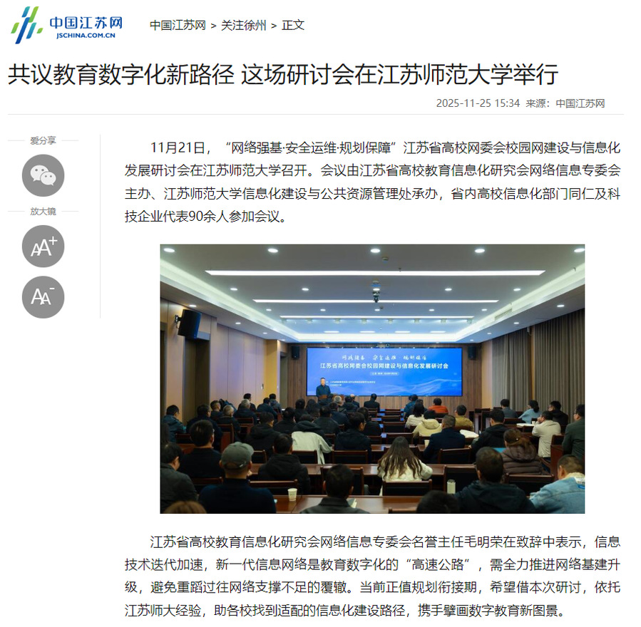 中国江苏网11月25日报道我校承办江苏省高校网委会校园网建设与信息化发展研讨会,报道内容如下: