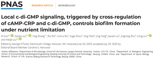 生命科学学院刘伟杰团队在SCI期刊《Proceedings of the National Academy of Sciences of the United States of America》(一区TOP)发表题为“Local c-di-GMP signaling, triggered by cross-regulation of cAMP-CRP and c-di-GMP, controls biofilm formation under nutrient limitation”的文章,揭示了细菌响应营养信号调控生物被膜的分子机制。