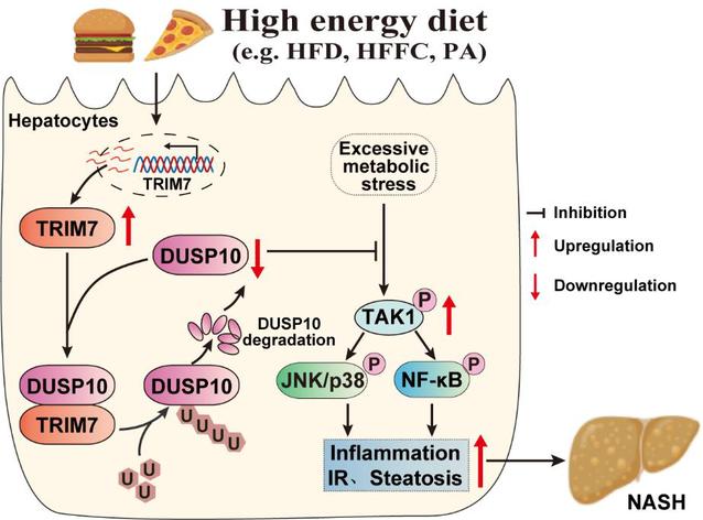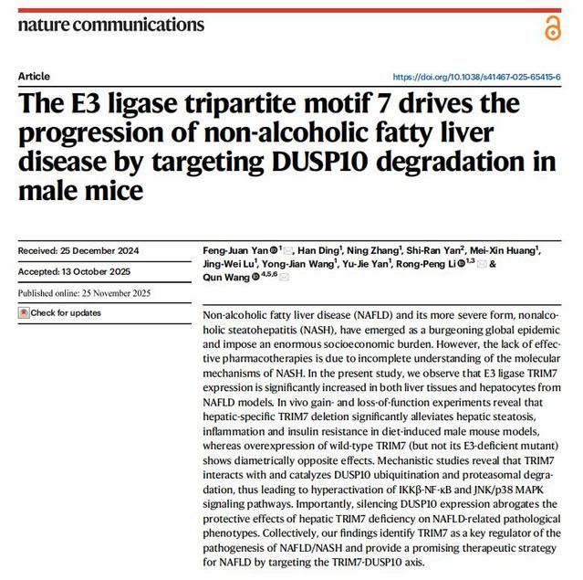 随着居民生活方式的改变与高脂肪饮食摄入的增加,非酒精性脂肪性肝病(NAFLD,现又称为代谢功能障碍相关脂肪性肝病 MASLD)已成为全球发病率最高的慢性肝脏疾病。其疾病谱涵盖单纯性脂肪肝、非酒精性脂肪性肝炎(NASH),并可进展为 NASH 相关肝纤维化、肝硬化甚至肝细胞癌。流行病学数据显示,过去十年间,NAFLD/NASH 已成为全球肝癌病因中增长最快的类型。然而截至目前,全球范围内仅一款药物获批上市,且存在患者应答率低、价格昂贵等问题,难以满足临床需求。深入解析疾病发病机制、挖掘新型治疗靶点,已成为该领域亟待突破的关键方向。该研究团队通过一系列体内外实验发现:E3 泛素连接酶三基序蛋白 7(TRIM7)可通过泛素化修饰介导 DUSP10 蛋白降解,进而激活 TAK1 信号通路及其下游级联反应促进肝脏脂肪变性、炎症反应加剧及胰岛素抵抗发生,最终推动 NAFLD 的疾病进展;该研究明确了 “TRIM7-DUSP10 轴” 作为 NAFLD 治疗靶点的巨大潜力,为开发新型靶向药物提供了新的理论依据与实验基础。
