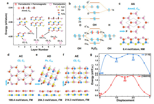 多铁性材料是指在单相材料中同时具备两种或两种以上可切换序参量(如铁磁性、铁电性、铁弹性等)的材料,因其在存储与逻辑器件等领域的应用潜力而受到广泛关注。然而,该领域仍面临一个关键性挑战:如何有效调控磁性相变。早在2020年,该团队首次在第一类二维多铁材料中提出了通过电场调控磁相变的策略,揭示了电控磁性的独特机制[Phys. Rev. Lett. 124, 067602 (2020)]。然而,探索二维多铁材料磁性调控新策略并揭示其新机制仍然是该领域的关键性科学问题。基于电子配对的基本原理,该团队提出了一种通过层间堆叠或滑移调控磁性相变新策略。采用吉林大学马琰铭院士团队自主研发的CALYPSO晶体结构预测技术并结合第一性原理计算方法,预言了一种新型二维分子铁电材料——水-羟基(H2O-OH)单层结构。在该单层结构中,铁磁性起源于OH基团2p成键轨道上的未配对电子。因此,通过调控层间结构,可实现磁性的可逆切换:一方面,层间堆叠促进H2O2分子形成,使未配对电子配对,从而诱导铁磁性向非磁性转变;另一方面,层间滑移抑制H2O2分子形成,恢复未配对电子,从而实现非磁性向铁磁性转变。此外,这一磁相变过程可被外加电场有效调控。重要的是,受该理论研究指导,中国科学院物理研究所冯宝杰教授等人采用低能电子辅助合成方法首次在Ag(111)表面合成了H2O–OH单层到多层结构。这项工作为二维铁电材料中磁性的有效调控提供了全新思路,拓展了多铁材料设计与应用的可能性。