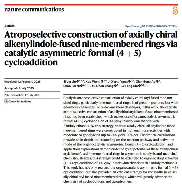 化学与材料科学学院石枫团队在SCI期刊《Nature Communications》(一区TOP)发表题为 “Atroposelective construction of axially chiral alkenylindole-fused nine-membered rings via catalytic asymmetric formal (4 + 5) cycloaddition”的文章,该文章高效构筑了轴手性功能分子。