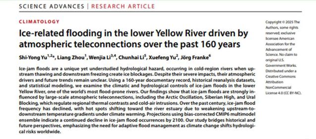地理测绘与城乡规划学院于世永团队在SCI期刊《Science Advances》(一区TOP)发表题为“Ice-related flooding in the lower Yellow River driven by atmospheric teleconnections over the past 160 years”的文章,系统揭示了黄河下游凌汛洪水在过去160年中的时空演变规律及其对全球变暖的响应机制。这一研究不仅为寒区河流洪水管理提供了全新的理论框架,还为相关政策制定和防灾减灾工作提供了重要科学依据。