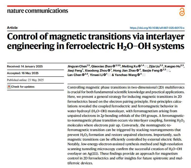 物理与电子工程学院李印威团队在SCI期刊《Nature Communications》(一区TOP)发表题为“Control of magnetic transitions via interlayer engineering in ferroelectric H2O–OH systems”的文章,报道了在二维铁电体系磁性调控方面的最新研究成果。