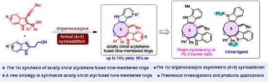 轴手性分子广泛存在于天然产物、生物活性分子、手性催化剂及配体、功能材料中。因此,轴手性分子的催化不对称合成已经成为一个重要的研究领域。轴手性芳环并中环是一类重要的轴手性分子,但是由于这类骨架的构筑既需要克服轴手性分子易消旋、骨架刚性的问题,又要应对中环构建中不利的熵效应、跨环张力,轴手性芳环并中环的催化不对称构筑极具挑战性。该成果发展了3-乙炔基-2-吲哚甲醇与2-吲哚乙醇的催化不对称形式(4+5)环加成反应,克服了轴手性芳环并中环不易构筑的问题,首次实现了轴手性乙烯基吲哚并九元环的高效构筑。这类新型轴手性分子不仅对人体前列腺肿瘤细胞PC-3具有较强的抑制作用,还可以通过简单的修饰转化成手性配体,在药物化学及手性催化剂开发方面都具有潜在的应用前景。此外,他们还通过理论计算,深化了对催化不对称形式(4+5)环加成反应的理解。