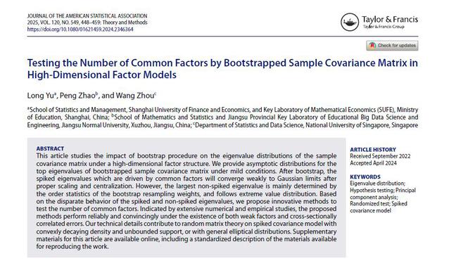 数学与统计学院赵鹏团队在SCI期刊《Journal of The American Statistical Association》(一区TOP)发表了题为“Testing the Number of Common Factors by Bootstrapped Sample Covariance Matrix in High-Dimensional Factor Models”的文章,旨在利用随机矩阵理论研究如何确定高维因子模型的公共因子数量这一基本统计学问题。