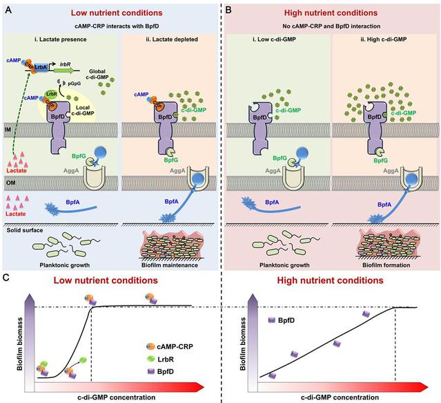 在革兰氏阴性菌中,无论菌体生长在营养丰富环境中还是营养贫乏环境中,c-di-GMP均是调控浮游生长和生物被膜切换的开关分子。但在不同营养环境中,c-di-GMP对生物被膜的调控作用是否存在差异尚不清楚。本研究发现在营养贫乏环境中,cAMP-CRP和c-di-GMP在转录和翻译后水平交叉调控生物被膜的发展。这个调控模型表明,在不同的营养环境中,细菌生物被膜的形成对胞内总c-di-GMP含量的敏感度不同。在营养丰富环境中,菌体需要合成大量的c-di-GMP分子才能维持高水平的生物被膜,这使得菌体更倾向于利用丰富的营养进行浮游生存。而当外界环境中营养贫乏时,菌体通过cAMP-CRP与c-di-GMP的交叉调控,使菌体在胞内c-di-GMP含量有限的情况下快速形成生物被膜,最终维持生存。第二信使cAMP和c-di-GMP在细菌中普遍存在,腐败希瓦氏菌的cAMP受体蛋白CRP与大肠杆菌和霍乱弧菌的CRP蛋白同源性高达88%。c-di-GMP磷酸二酯酶LrbR含有保守的EAL结构域,c-di-GMP受体蛋白BpfD含有退化的GGDEF和EAL结构域,这两种结构域在细菌中也普遍存在。这说明本研究揭示的调控模型可能在细菌中普遍存在。更重要的是,不同营养环境中生物被膜的调节模型差异的发现为今后针对性地防控不同营养环境中生物被膜的形成提供理论依据。