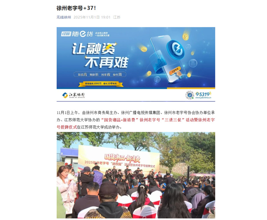 徐州广电“无线徐州”11月1日报道徐州老字号“三进三促”活动暨徐州老字号授牌仪式在江苏师范大学成功举办,报道内容如下: