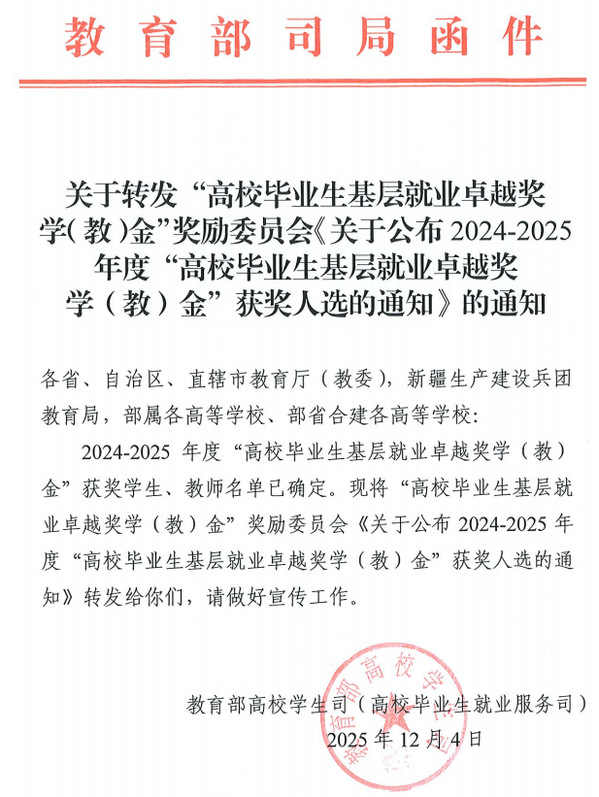 高校毕业生基层就业卓越奖学(教)金由教育部高校学生司(高校毕业生就业服务司)、教育部学生服务与素质发展中心共同指导评选,旨在表彰在基层就业创业中表现突出、取得显著成绩的普通高校毕业生和在指导学生赴基层就业工作中贡献突出的高校教师。