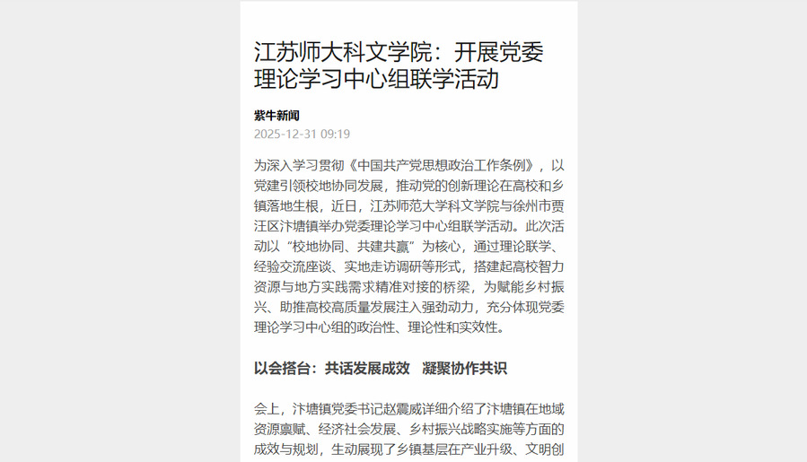 为深入学习贯彻《中国共产党思想政治工作条例》,以党建引领校地协同发展,推动党的创新理论在高校和乡镇落地生根,近日,江苏师范大学科文学院与徐州市贾汪区汴塘镇举办党委理论学习中心组联学活动。此次活动以“校地协同、共建共赢”为核心,通过理论联学、经验交流座谈、实地走访调研等形式,搭建起高校智力资源与地方实践需求精准对接的桥梁,为赋能乡村振兴、助推高校高质量发展注入强劲动力,充分体现党委理论学习中心组的政治性、理论性和实效性。