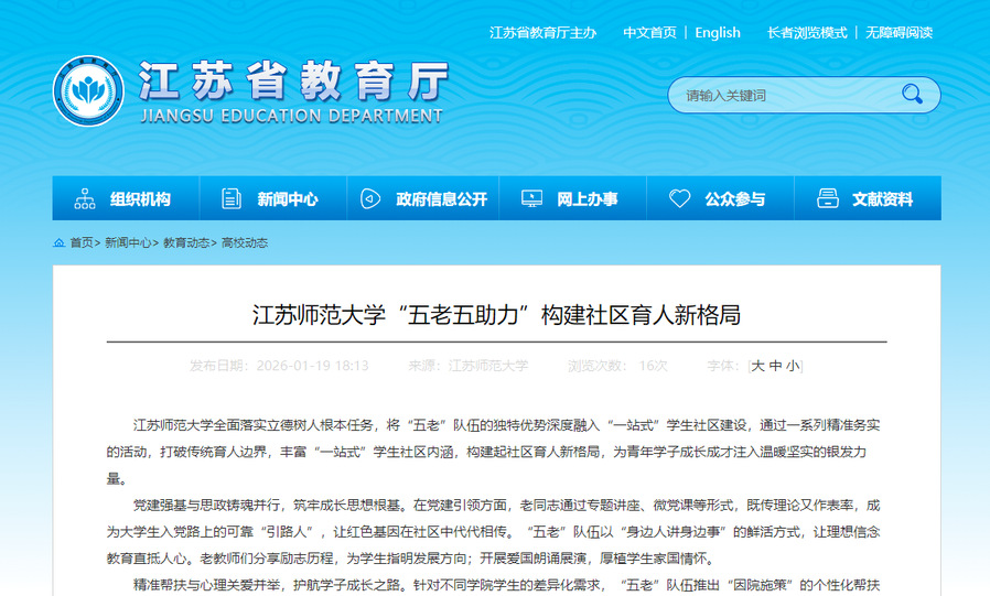 江苏省教育厅官网1月19日关注我校“五老五助力”构建社区育人新格局工作经验,内容如下: