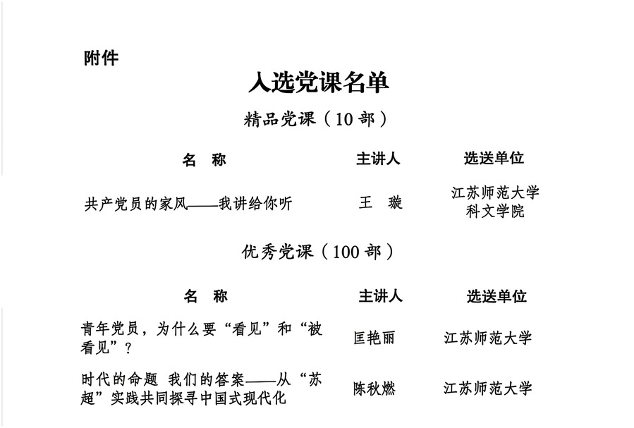 本次活动以强化理论武装、筑牢思想根基、培育时代新人为目标,面向全省高校征集优秀党课作品。经专家严格评审,我校科文学院党委选送的《共产党员的家风——我讲给你听》(主讲人:王璇)获评“精品党课”(全省共10部);马克思主义学院党委选送的《青年党员,为什么要“看见”和“被看见”?》(主讲人:匡艳丽)、生命科学学院党委选送的《时代的命题我们的答案——从“苏超”实践共同探寻中国式现代化》(主讲人:陈秋燃)2部作品获评“优秀党课”(全省共100部)。
