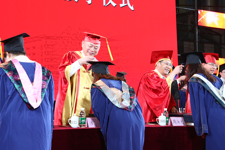副校长、校学位评定委员会副主席蔡国春宣读学位授予决定。校领导、校学位评定委员会委员为全体2023届毕业研究生正冠拨穗并颁发学位证书。