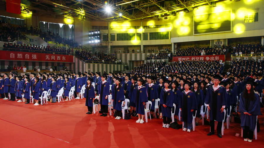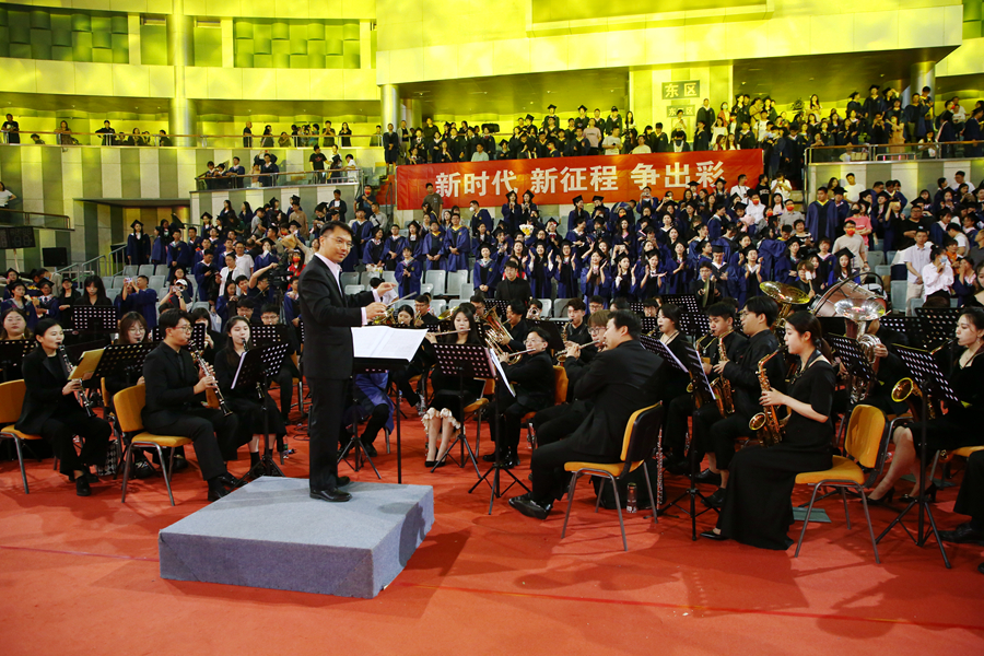 典礼正式开始前播放了视频短片《北迁》《远航》,带领研究生重温师大历史以及三年求学岁月的美好记忆。音乐学院研究生的快闪表演,歌声清澈,朝气蓬勃,展现了我校研究生阳光向上的精神面貌,将现场的气氛烘托得活泼热烈。