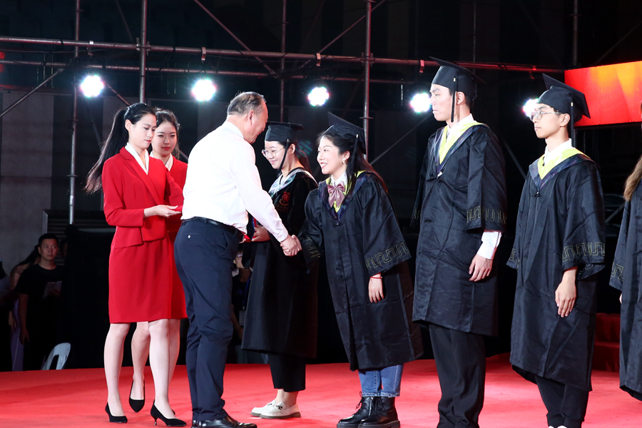 在师大的四年,他们勤奋学习,不断探索,用坚韧不拔、勇往直前的意志品质绘制出属于自己的美好蓝图。校学位评定委员会副主席、校党委副书记、副校长刘广登宣读了《本科生学士学位授予决定》。校长周汝光为毕业生代表授予学位证书并拨穗。各学院党政负责人代表全体毕业生接受了周汝光校长授予的毕业证书与学位证书。