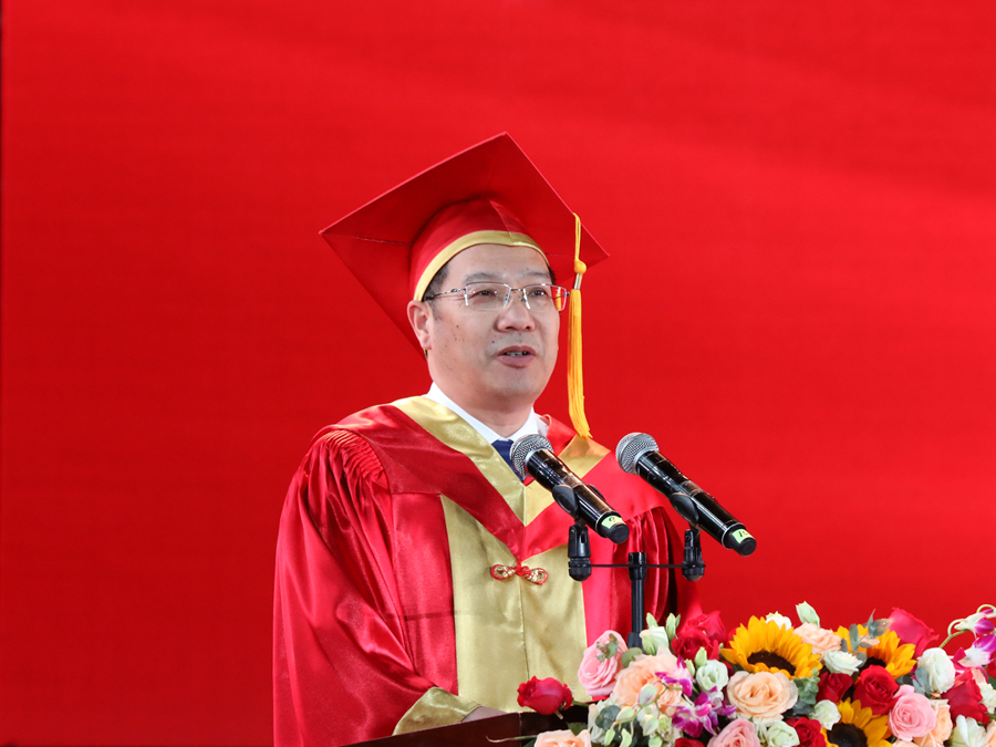 校学位评定委员会主席、校长周汝光在典礼上致辞,代表全校师生员工,向圆满完成学业的毕业生同学表示热烈祝贺,向精心培育、关心支持毕业生成长的家长和老师致以衷心感谢和崇高敬意,向过去几年因疫情原因未能参加毕业典礼的往届毕业生代表表示热烈欢迎。周汝光在致辞中带领全体毕业生同学回顾了四年求学之路的点点滴滴和江苏师大这四年取得的发展成就。他指出,大学毕业是人生下一个征途的开始,希望同学们作为母校最闪亮的名片,永远秉持“崇德厚学,励志敏行”的校训,用智慧奉献社会,用美德影响他人,以奋发的精神状态和优异的工作业绩,讲好师大故事,传播师大声音,为母校增光添彩。周汝光勉励同学们,要笃学不怠,永葆求索之心;要知行合一,砥砺奋斗之志;要坚守初心,厚植爱国之情。他希望同学们在祖国波澜壮阔的现代化建设进程中,践行报国之志,贡献青春力量。