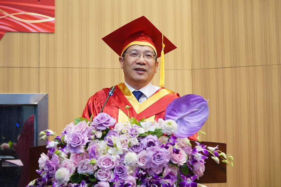 周汝光为2023届毕业生代表颁发毕业证书、授予学士学位,之后发表了热情洋溢的讲话。他对毕业生同学在世界变局之际、疫情冲击之下勇担重任,勤奋笃学,茁壮成长给予了充分肯定,并对全体毕业生提出了三点期待:一是心存青云志,始终胸怀“国之大者”;二是身持行动令,始终坚持“学思践悟”;三是永葆卓越心,始终相信“时代和未来”。他祝愿全体2023届敬文学子前程似锦绣,再创新辉煌。