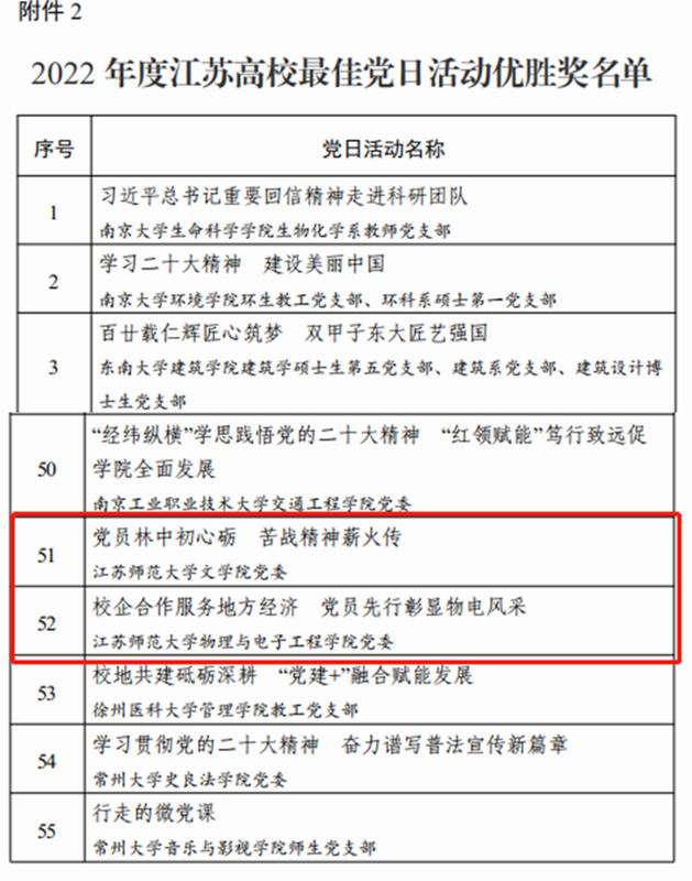 文学院党委“党员林中初心砺 苦战精神薪火传”、物理与电子工程学院党委“校企合作服务地方经济 党员先行彰显物电风采”获2022年度江苏高校最佳党日活动优胜奖,机关第二十二党支部“‘支部在线’推动高校基层党建工作数字化转型”获2021—2022年度江苏高校党建工作创新奖二等奖,公共管理与社会学院政治与公共管理系党支部、研究生党支部“口述历史传承抗美援朝精神 培根铸魂夯实党员信仰之基”获2021—2022年度江苏高校党建工作创新奖三等奖,文学院党委、物理与电子工程学院党委、机关第十五党支部、科文学院党委文理学院党总支被授予徐州市教育系统“先进基层党组织”称号,郝其宏、张辉、王娟(教科)、刘江、鲍文娜(科文)同志被授予徐州市教育系统“优秀共产党员”称号,王本贤、戚洪、杜昀、张立荣(科文)同志被授予徐州市教育系统“优秀党务工作者”称号。