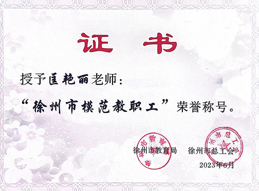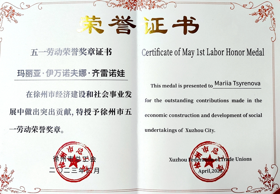 为大力弘扬劳模精神、劳动精神、工匠精神,深入贯彻落实习近平总书记关于教育的重要论述,引领全市职工奋发进取、拼搏奉献,为中国式现代化徐州新实践再创佳绩,经全市各单位逐级民主推选、综合评议和公示,近日,徐州市总工会、徐州市教育局、徐州市妇女联合会等单位,先后表彰了一批先进集体和个人(徐工发〔2023〕16号、徐教〔2023〕19号)、徐教师〔2023〕2号)。我校中俄学院俄罗斯籍教师MARIIA TSYRENOVA(玛丽亚·伊万诺夫娜·齐雷诺娃)荣获2023年“徐州市五一劳动荣誉奖章”;马克思主义学院匡艳丽老师荣获2023年“徐州市模范教职工”称号;文学院张爱玲老师荣获2023年度“徐州市优秀女教师”称号。