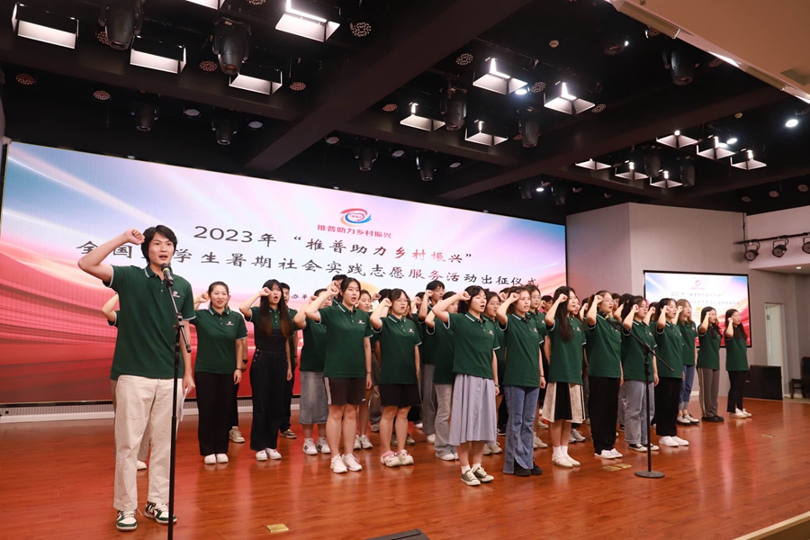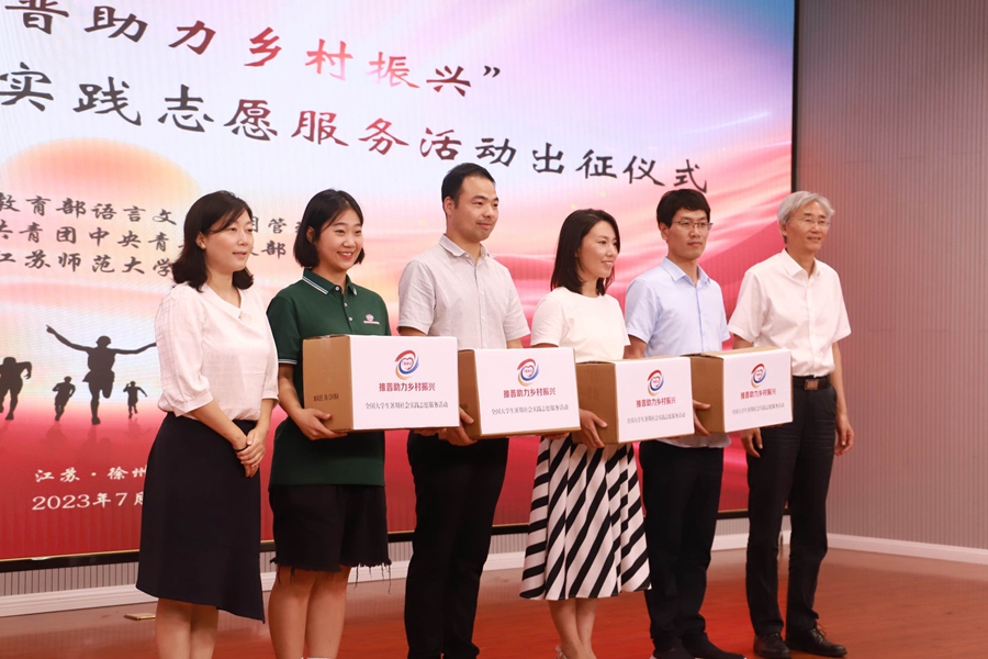 7月9日,由教育部语言文字应用管理司、共青团中央青年发展部共同主办的2023年“推普助力乡村振兴”全国大学生暑期社会实践志愿服务活动出征仪式在我校举行。教育部语言文字应用管理司宣教处处长张艳,我校党委书记方忠,副校长钱进和教育部长江学者特聘教授,江苏师范大学国家语委语言能力高等研究院院长杨亦鸣出席出征仪式。来自北京大学、清华大学等573所高校1176支团队的大学生志愿者通过线上线下的方式参加出征仪式。出征仪式上,张艳处长和杨亦鸣教授为实践团代表授予物资,江苏师范大学志愿者代表仲俊儒带领实践团学生代表进行庄严宣誓。出征仪式结束后,12405名大学生志愿者将在短暂培训过后分赴祖国大地的边疆地区、民族地区和农村地区开展推普助力乡村振兴社会实践活动。