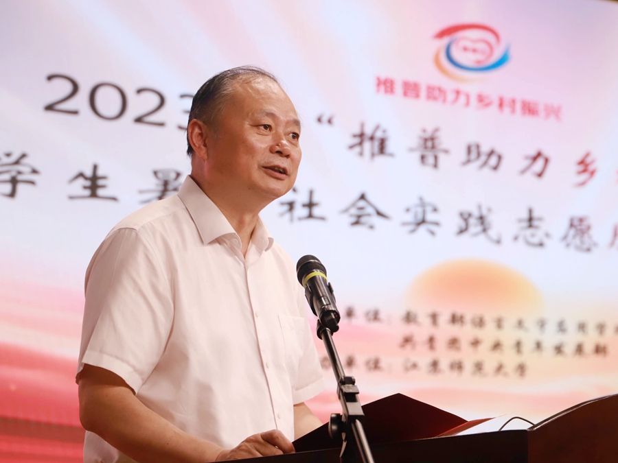 方忠代表学校在出征仪式上致辞,简要介绍了我校在“推普助力乡村振兴”中承担的有关工作和取得的成绩。他希望“推普助力乡村振兴”实践团队的全体志愿者能够勇担时代赋予的重任,不怕苦,不怕累,用自己的所学所长做好实践服务,以实际行动为推进乡村振兴作出贡献。