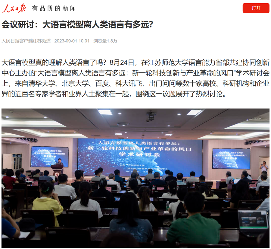 人民日报客户端9月1日报道在我校举行的“大语言模型离人类语言有多远:新一轮科技创新与产业革命的风口”学术研讨会,报道内容如下: