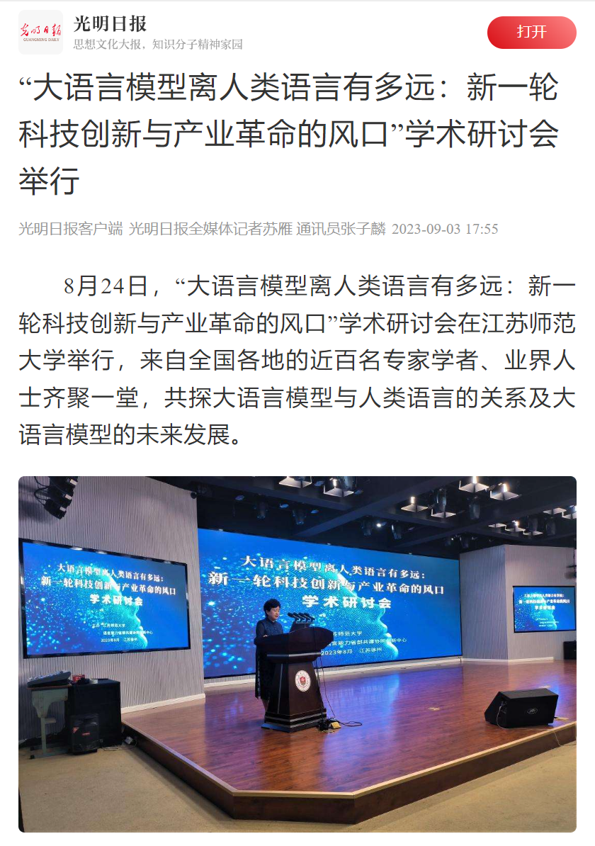 光明日报客户端9月3日报道我校举行的“大语言模型离人类语言有多远:新一轮科技创新与产业革命的风口”学术研讨会,报道内容如下: