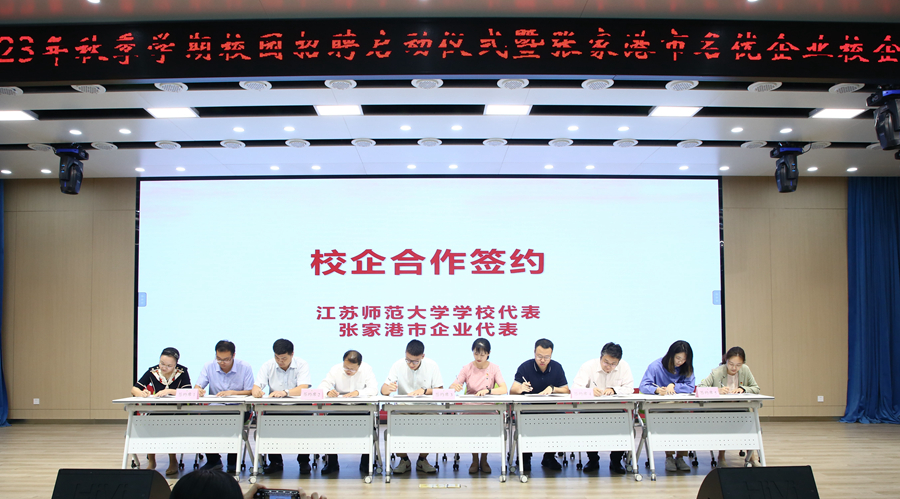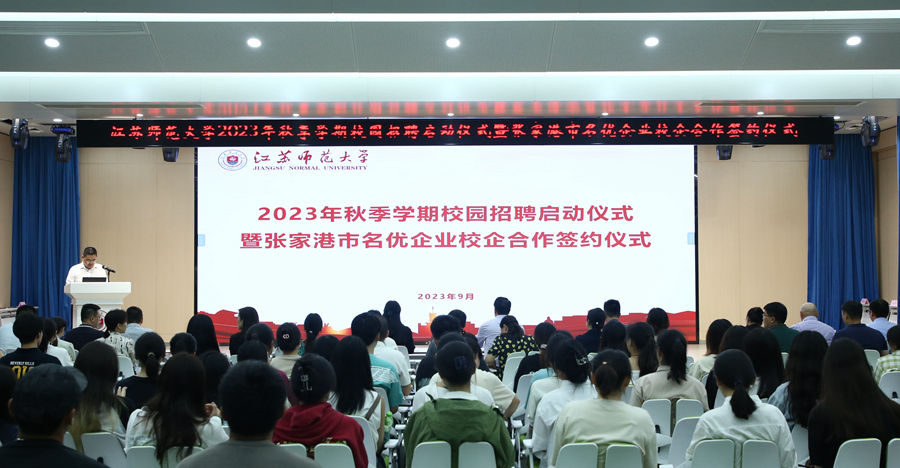 9月5日下午,我校2023年秋季学期校园招聘启动仪式暨张家港市名优企业校企合作签约仪式在泉山校区路演大厅举行。校党委常委、副校长张玉勤,张家港市人力资源和社会保障局党委委员、人力资源管理服务中心主任盛宇红及其相关部门负责人,张家港市24家知名企业人力资源主管,校研究生院、学生工作处相关领导,各学院党委副书记、就业辅导员,2024届毕业生代表参加了活动。