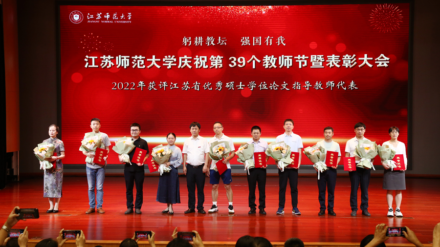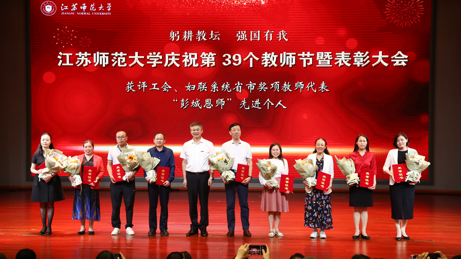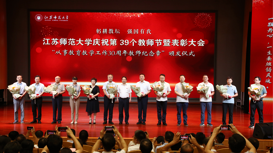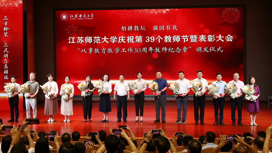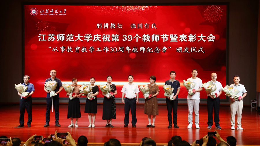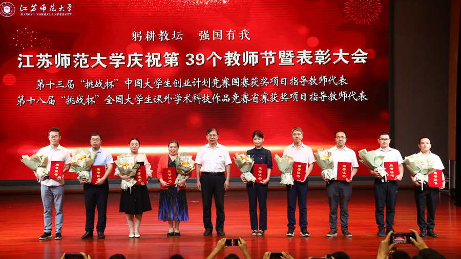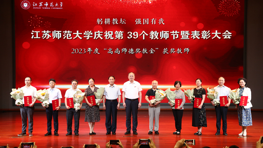 步锦昆代表江苏省教育基金会讲话,向工作在教育事业一线的广大教职工致以节日问候和诚挚感谢,向获得表彰的集体和个人表示热烈祝贺。他表示,习近平总书记关于教育的重要论述,为全面深化新时代教师队伍建设、推动大学高质量发展提供了根本遵循。省教育基金会在高校设立“高尚师德奖教金”,旨在弘扬中华民族优秀传统美德,助力学校加强师德师风建设。衷心希望江苏师范大学的全体老师以受表彰的老师为榜样,不忘初心、牢记使命,爱岗敬业、教书育人,修身崇德、砥砺前行,努力做“有理想信念、有道德情操、有扎实学识、有仁爱之心”的“四有”好老师和做“学生锤炼品格、学习知识、创新思维、奉献祖国”的“四个引路人”。