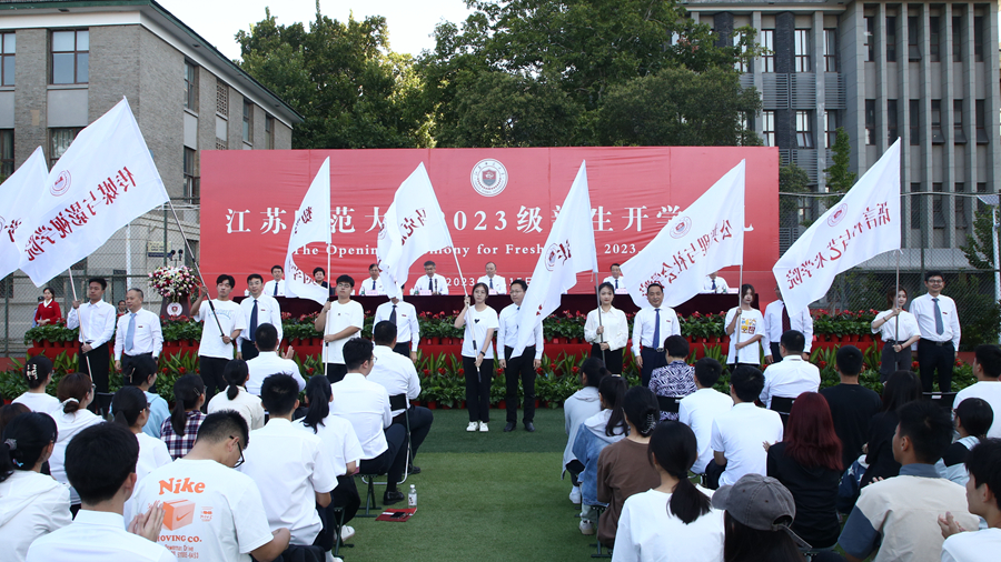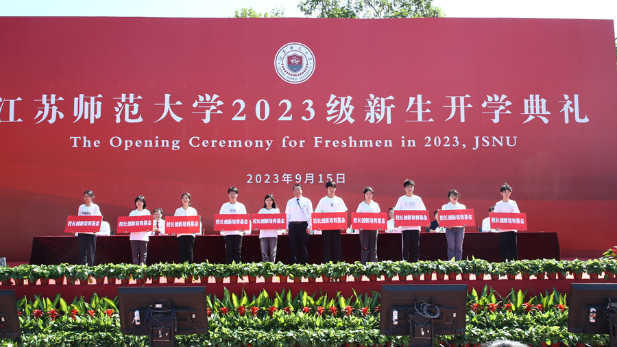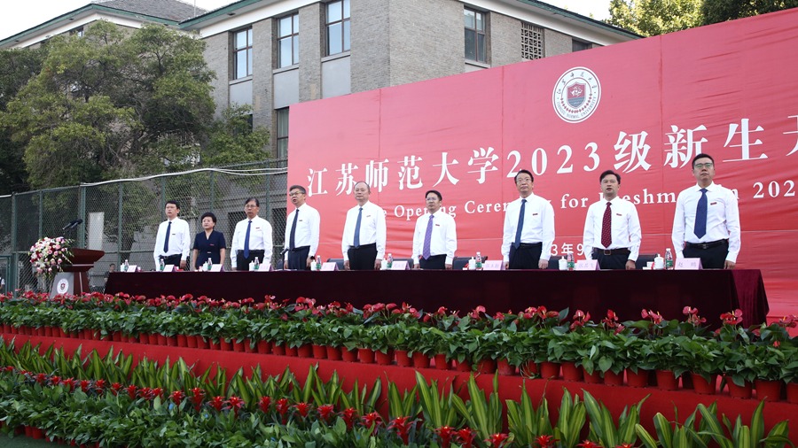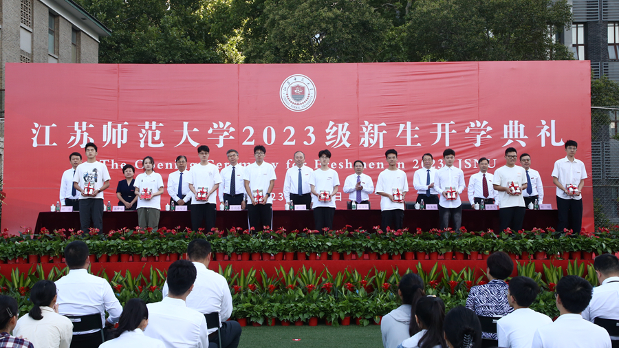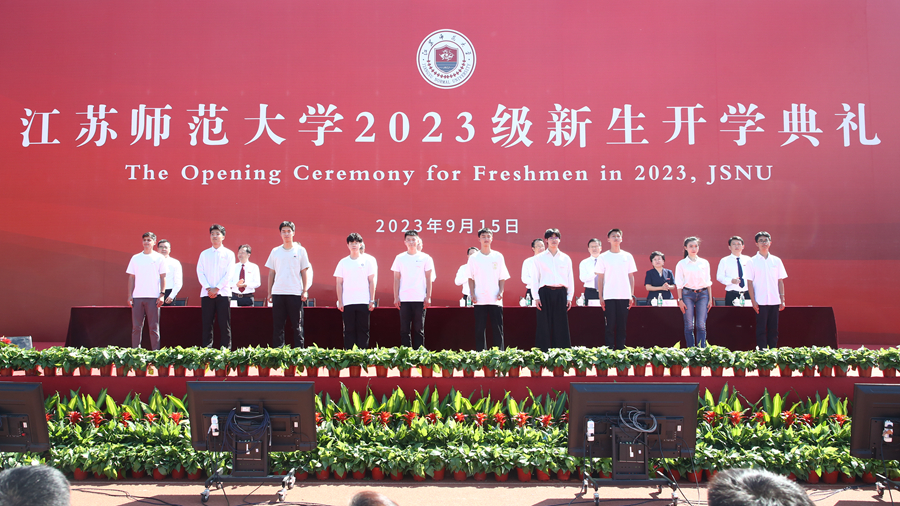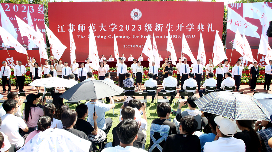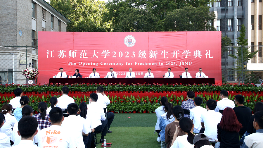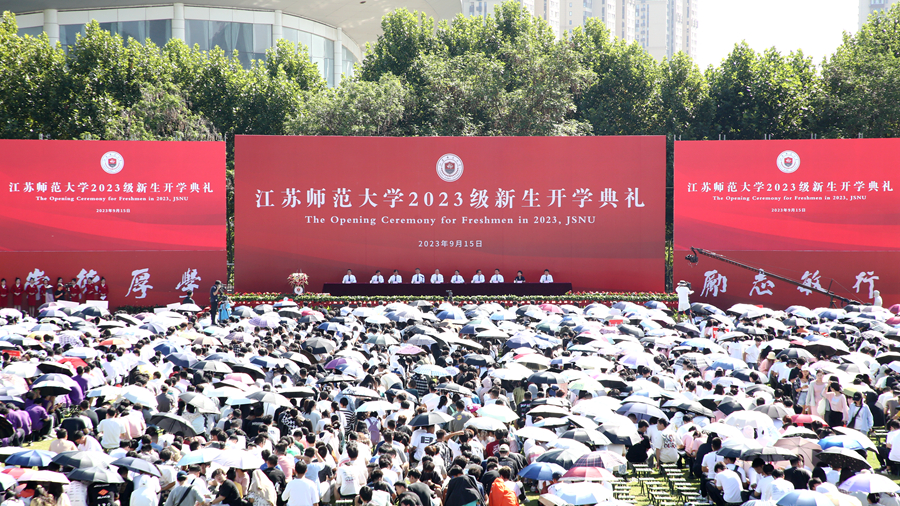 莘莘学子聚苏师,昂首阔步新征程。在这金秋九月,我校迎来了8094名2023级新同学。9月15日上午,江苏师范大学2023级新生开学典礼隆重举行。在校全体校领导出席典礼,校机关部门主要负责同志,各学院党政负责人、副书记、辅导员,教师代表,校友代表,老生代表,以及全体2023级本科生和硕士、博士研究生参加典礼。典礼在泉山校区田径场和云龙校区体育场分别举行。校党委副书记蔡国春主持典礼。
