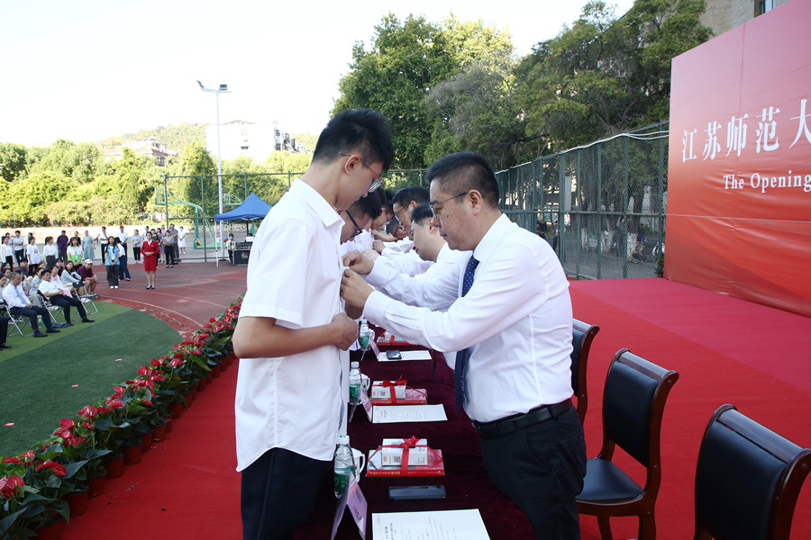 千里奔赴为求学,从此镌刻苏师人。江苏师范大学2023级学生,辞别父母,离别家乡,结缘师大,从此就像他们佩戴的校徽一样,“江苏师范大学”这六个字将深深镌刻在他们的心中。在全体校领导为学生代表佩戴校徽这一刻,台下的所有2023级学生也将他们手中的江苏师范大学校徽佩戴在自己的胸口,成为江苏师大的一份子。