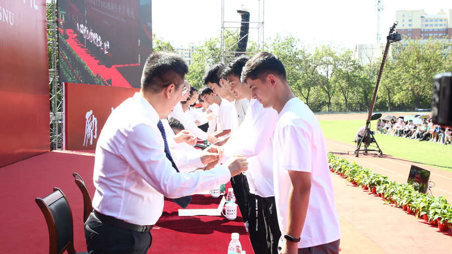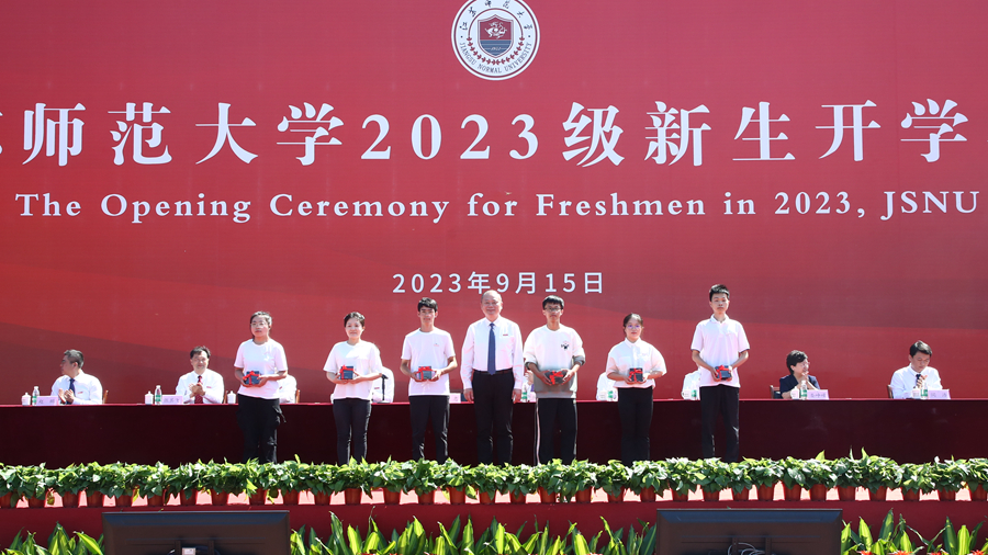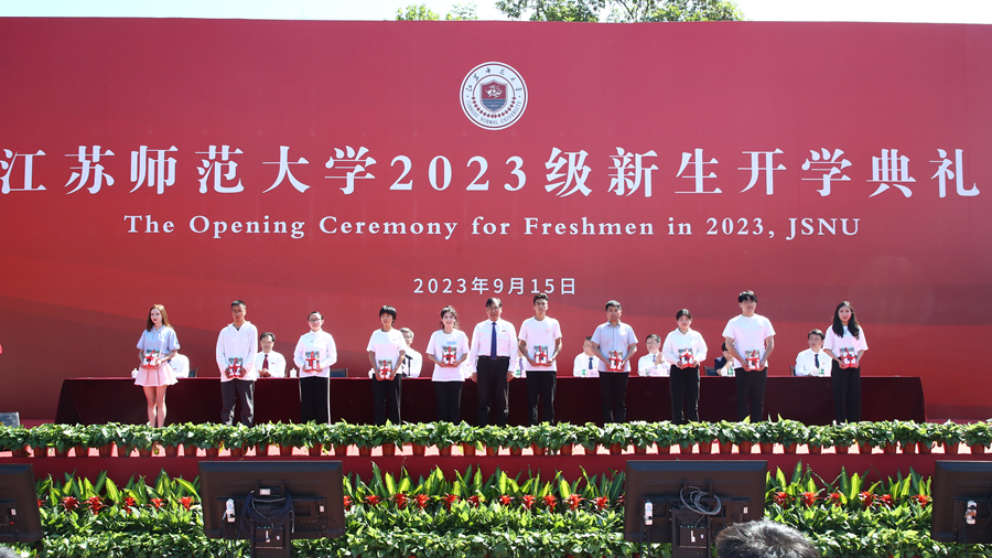 2023级学生中,有很多杰出代表,其中包括了少数民族、青海师大来校交流、研究生入学考试单科最高分同学,今年因抗洪救灾,在部队立功受奖的同学。正是由千千万万不同地区、不同境遇的学子,组成了江苏师范大学这样一个温暖的大家庭。副校长杜增吉代表学校向优秀新生代表赠送了开学礼物。