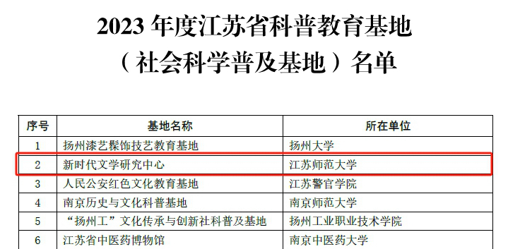 近日,江苏省科学技术协会、江苏省哲学社会科学界联合会、江苏省科学技术厅、江苏省教育厅联合下发《关于认定2023年度江苏省科普教育基地的通知》,我校“新时代文学研究中心”成功获批江苏省社会科学普及基地,成为我校首家省级社会科学普及基地。