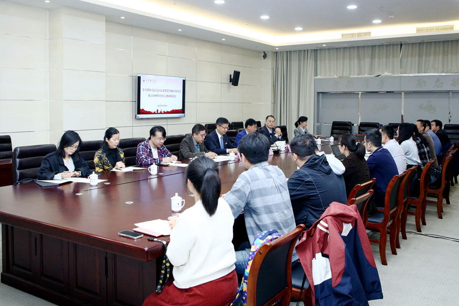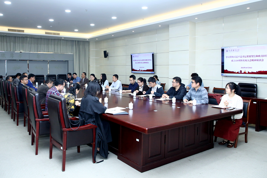 10月30日上午,我校召开学习贯彻习近平总书记重要贺信和欧美同学会成立110周年庆祝大会精神座谈会。校党委副书记蔡国春,校党委常委、副校长、校欧美同学会会长杜增吉,校党委常委、组织部部长、统战部部长黄德志出席会议。会议由校党委常委、副校长、校欧美同学会副会长赵鹏主持。校欧美同学会秘书长陈健领学了习近平总书记的贺信和欧美同学会成立110周年庆祝大会有关精神。欧美同学会全体理事、会员代表及部分优秀留学归国人员代表参加座谈会。