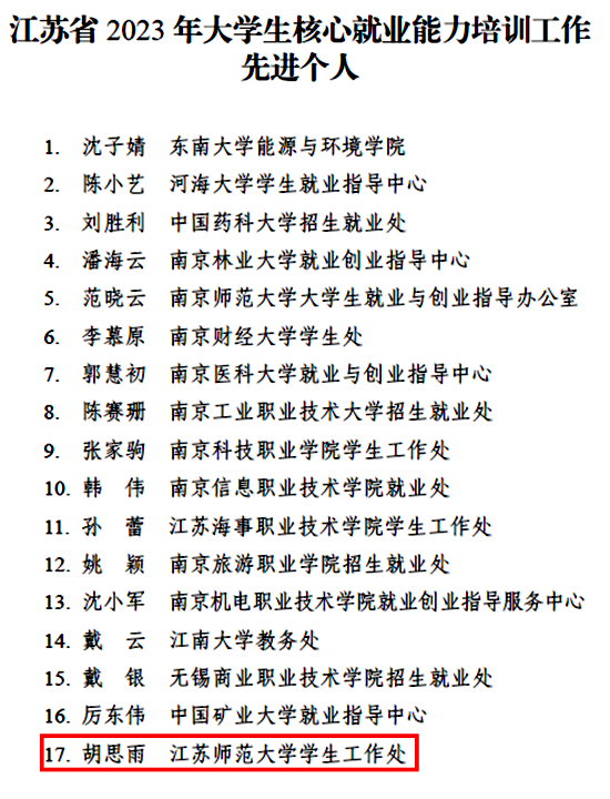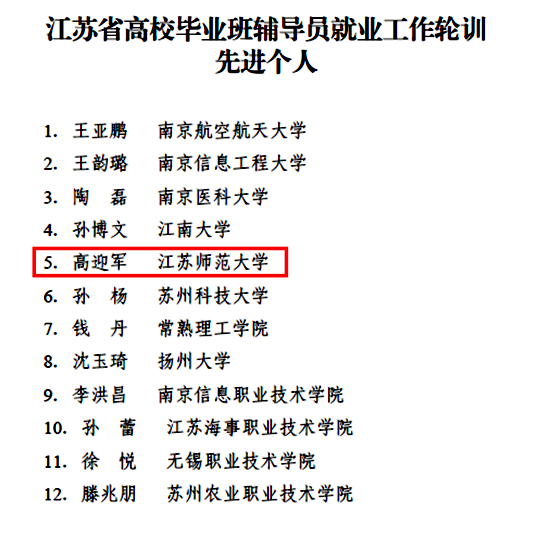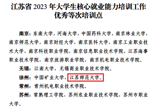 近日,在江苏省2023年大学生核心就业能力培训和2024届江苏省高校毕业班辅导员就业工作轮训的两项考评中,我校均获优秀等次,分别被评为“江苏省2023年大学生核心就业能力培训工作优秀等次培训点”和“江苏省高校毕业班辅导员就业工作轮训先进基地”。同时分别负责这两项工作的相关老师均获评“先进个人”称号。