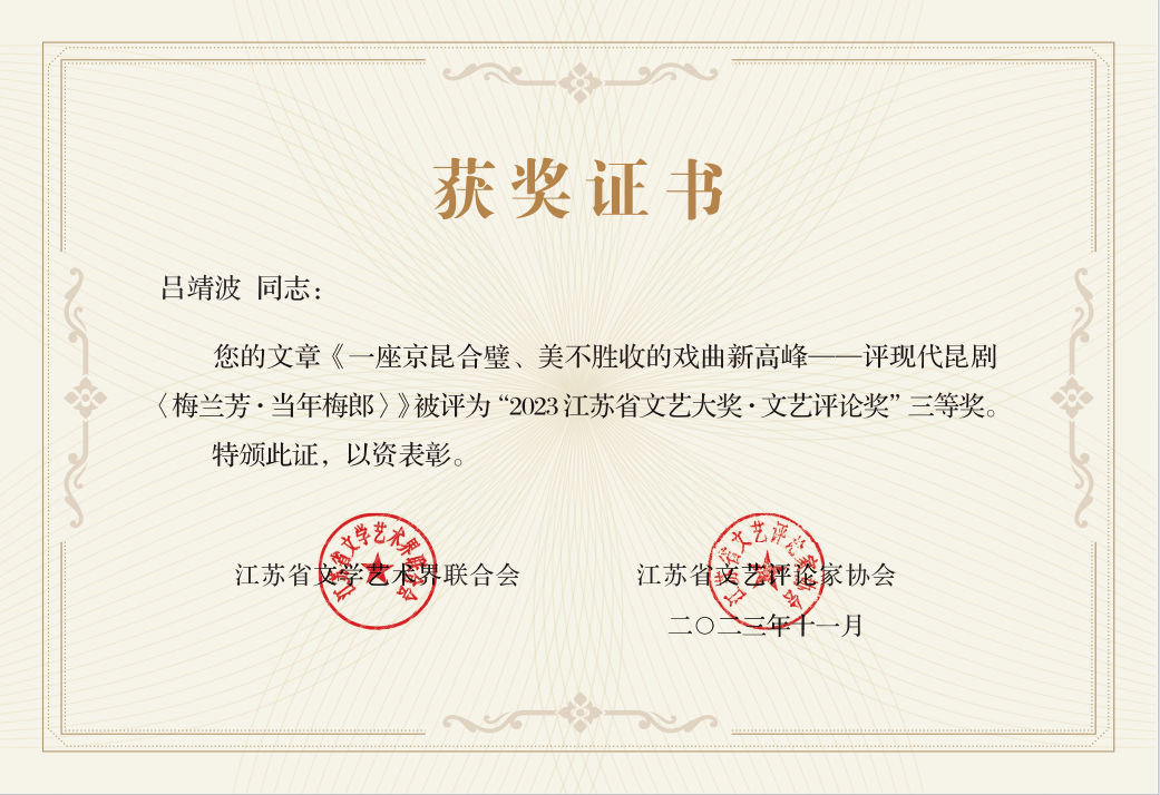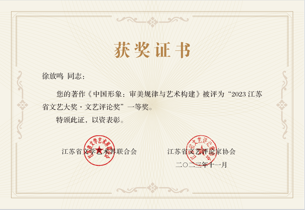 我校文学院徐放鸣教授申报作品《中国形象:审美规律与艺术构建》(徐放鸣等著,高等教育出版社,2023年2月版),荣获2023年江苏省文艺大奖·文艺评论奖,位列一等奖第一名。学报编辑部主任吕靖波教授申报作品《一座京昆合璧、美不胜收的戏曲新高峰——评现代昆曲<梅兰芳·当年梅郎>》(《艺术百家》,2021年第1期),荣获2023年江苏省文艺大奖·文艺评论奖三等奖。